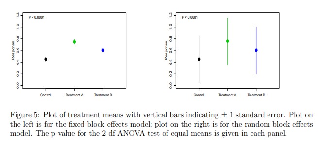 | Standard error of treatment means | $$\sqrt{\frac{\sigma^2}{b}}$$ | $$\sqrt{\frac{\sigma^2 + \sigma^2_b}{b}}$$ |