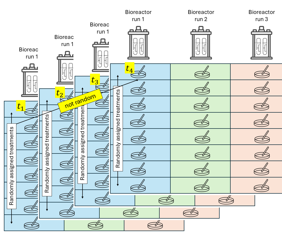 \[y_{ijkl} = \mu + \tau_i + \alpha_j + (\tau \alpha)_{ij} + u_{k} + v_{ijkl} + \varepsilon_{ijkl},\\ u_{k} \sim N(0, \sigma^2_u),\]where \(y_{ijk}\) is the observation for the \(i\)th treatment, \(j\)th time, in the \(k\)th block and the \(l\)th repetition within that block, \(\mu\) is the overall mean, \(\tau_i\) is the main effect of the \(i\)th level of treatment factor 1 (treatment), \(\alpha_j\) is the main effect of the \(j\)th level of treatment factor 2 (time), \((\tau \alpha)_{ij}\) is their interaction, \(u_k\) is the random effect of the \(k\)th block, \(v_{ijkl}\) is the random effect of the \(i\)th “miniblock” (whole plot) at the \(j\)th time, in the \(k\)th block and the \(l\)th repetition within that block, and \(\varepsilon_{ijkl}\) is the residual.