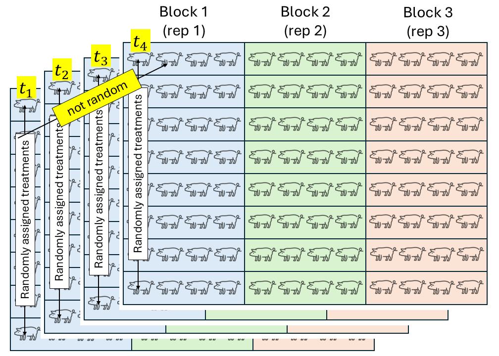 We assume that the experimental units did not experience similar conditions, but that an expert could determine groups of experimental units that did experience similar conditions. We call these groups of experimental units that experienced similar conditions “Blocks”. In a field experiment setting, that means that groups of plots were located in approximately homogeneous areas called blocks. In a study dealing with animals,this could be a repetition (i.e., a group of animals studied for the same timeframe). In a laboratory setting,this could be a day or a week where the scientists run the experiment.