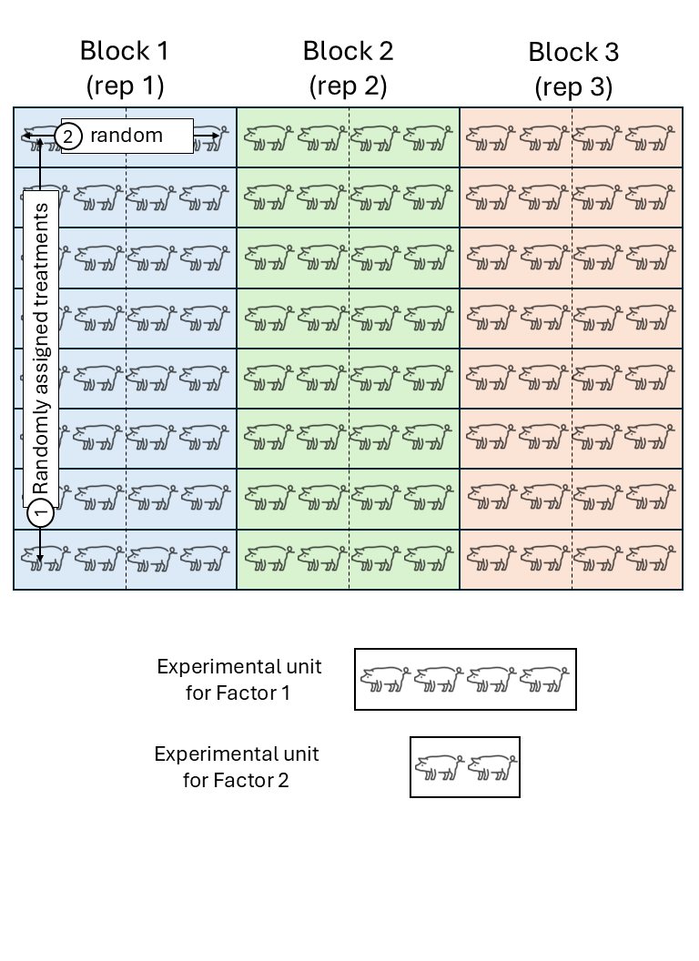 - Within the whole plots, the levels of the other treatment factor are randomly assigned to its experimental units (split plots), which are subsections of the whole plots. Note: we could think of the whole plots acting as “mini blocks” for the second treatment factor.