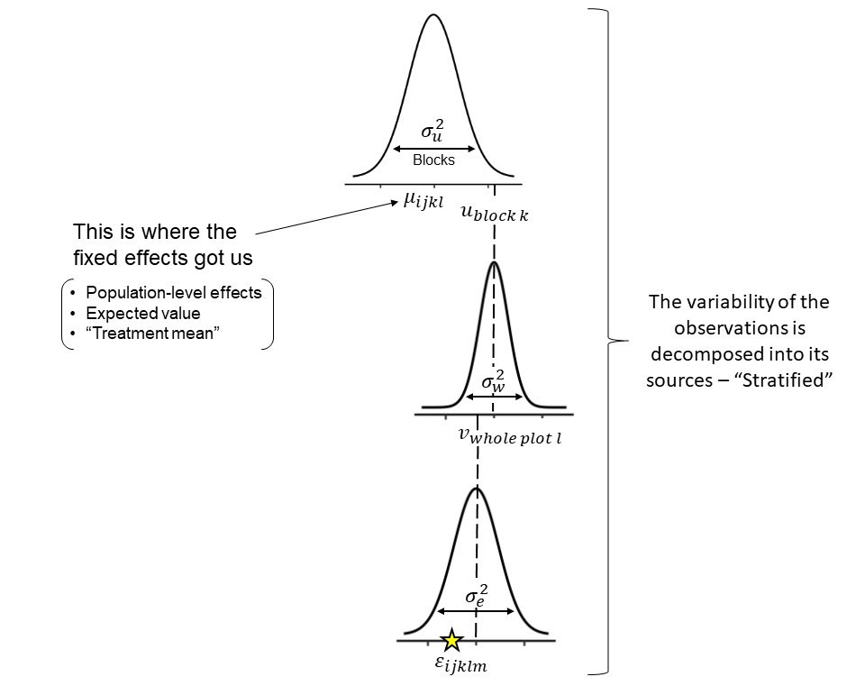 - \(v_j\) is the fixed effect of variety applied to the subplot level.
