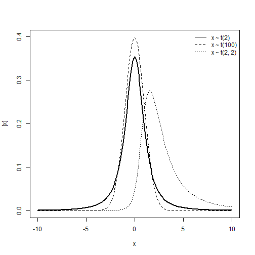 \[y\sim t_{\nu}(\mu, \; \sigma^2)\] \[E(y) = \begin{cases} \mu, & \text{if } \nu > 1 \\ \text{undefined}, & \text{if } \text{else} \end{cases}\] \[Var(y) = \begin{cases} \frac{v}{v-2} \sigma^2, & \text{if } \nu > 2 \\ \text{undefined}, & \text{if } \text{else} \end{cases}\]Support: